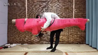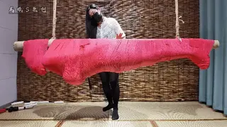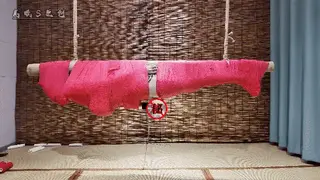 红色过膝长靴单手套超紧直臂链接股绳吊缚双口环口夹强制抬头放置